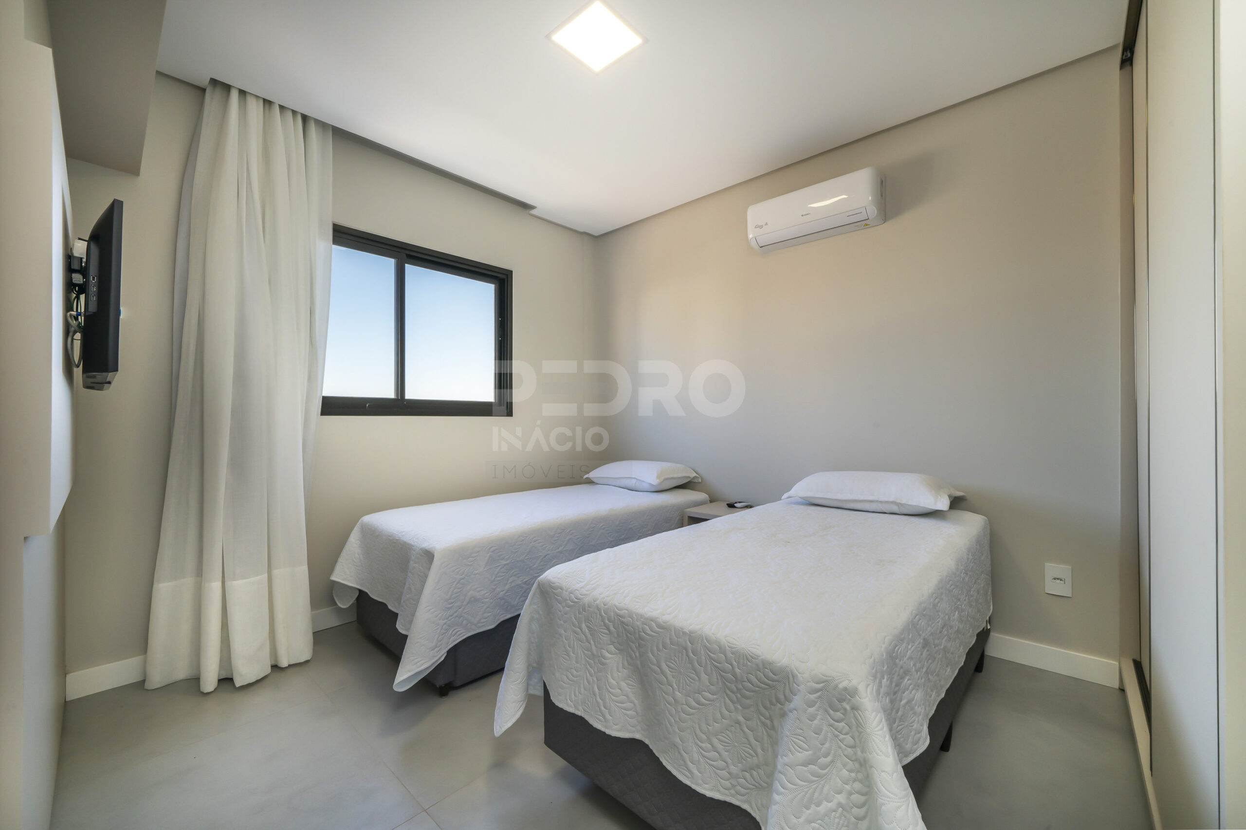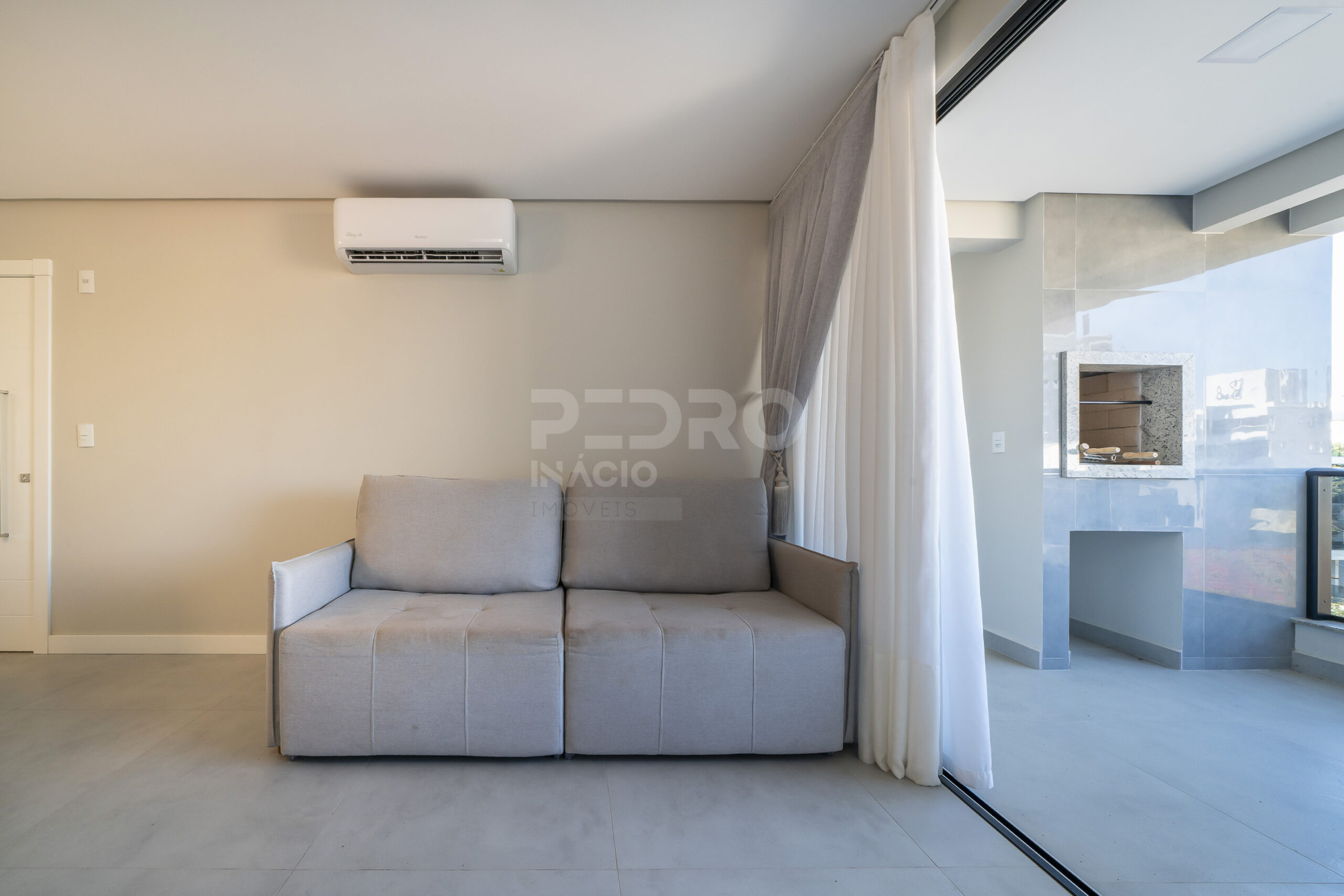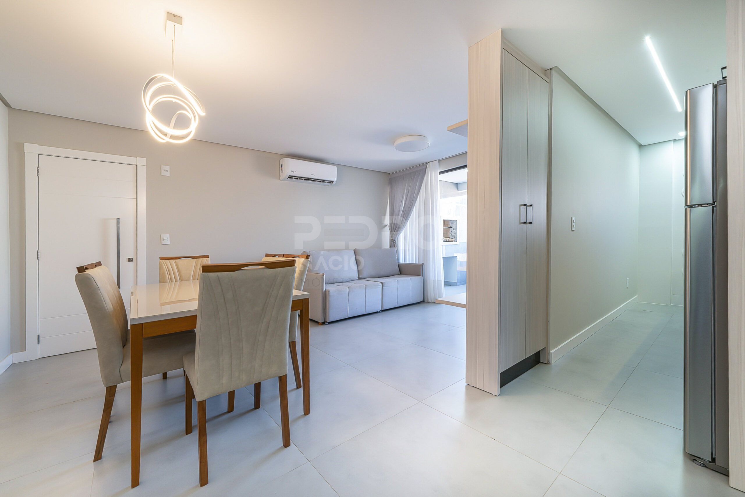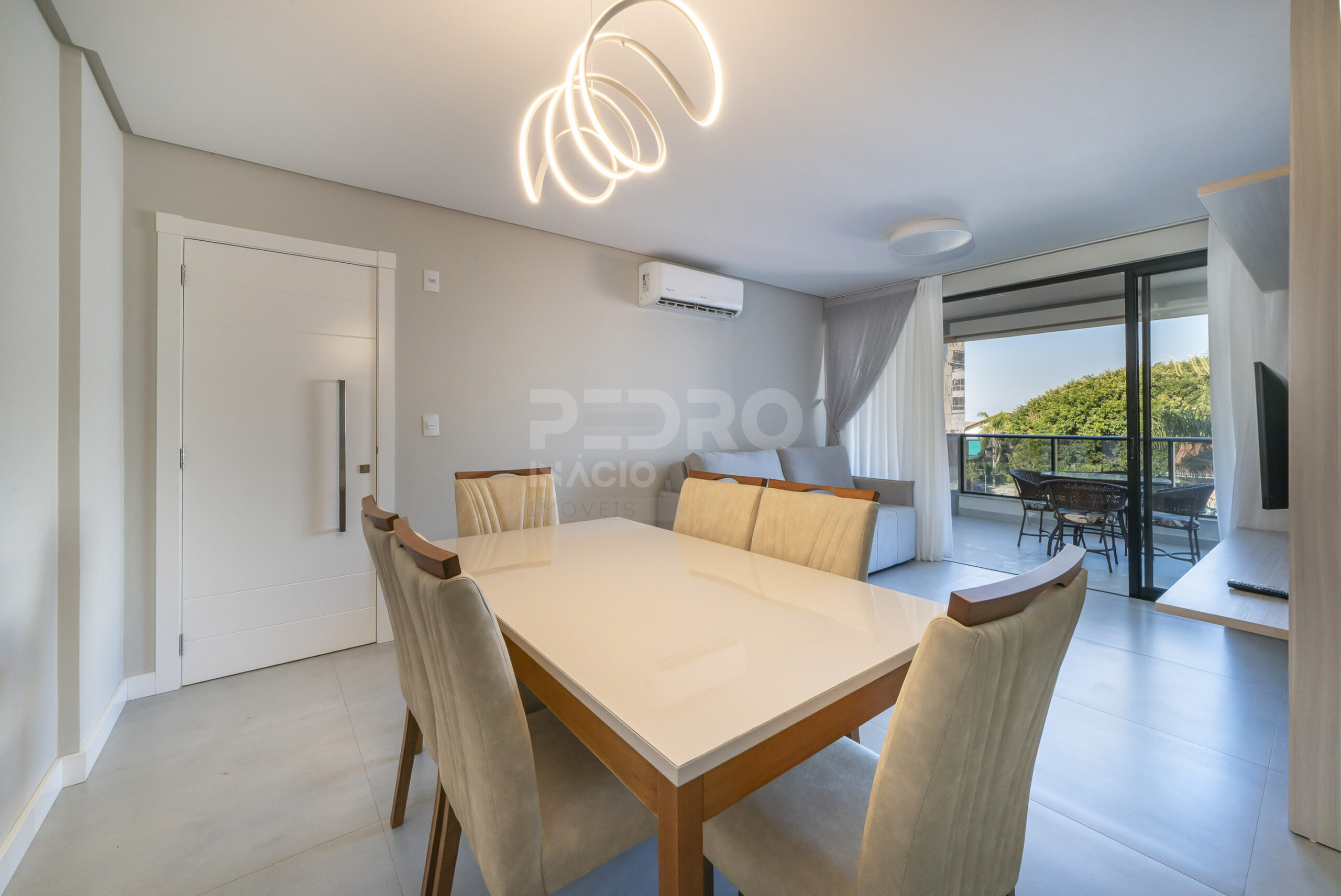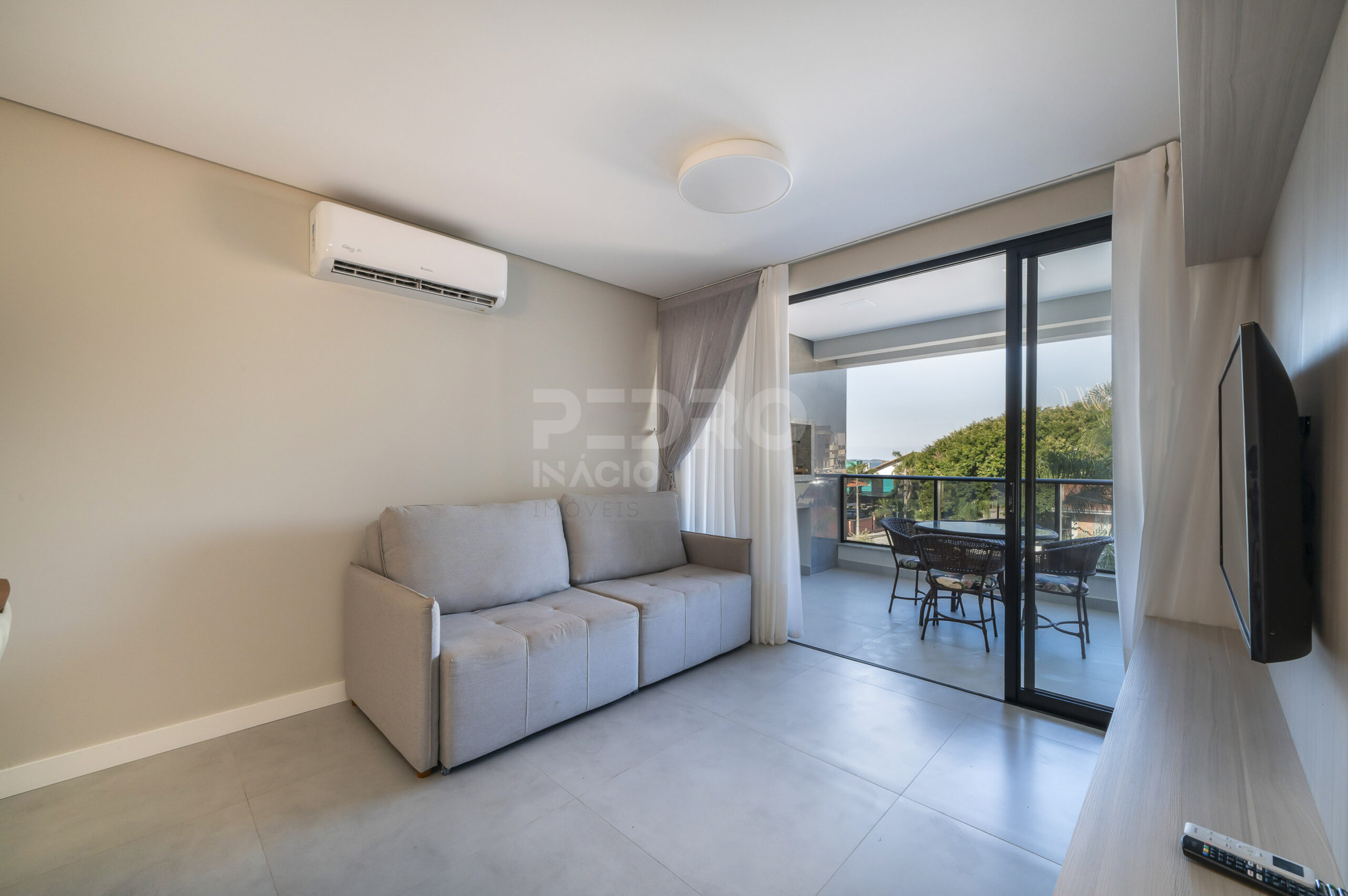 *Salas de estar e jantar integradas com sofá cama, tv e ar condicionado;
