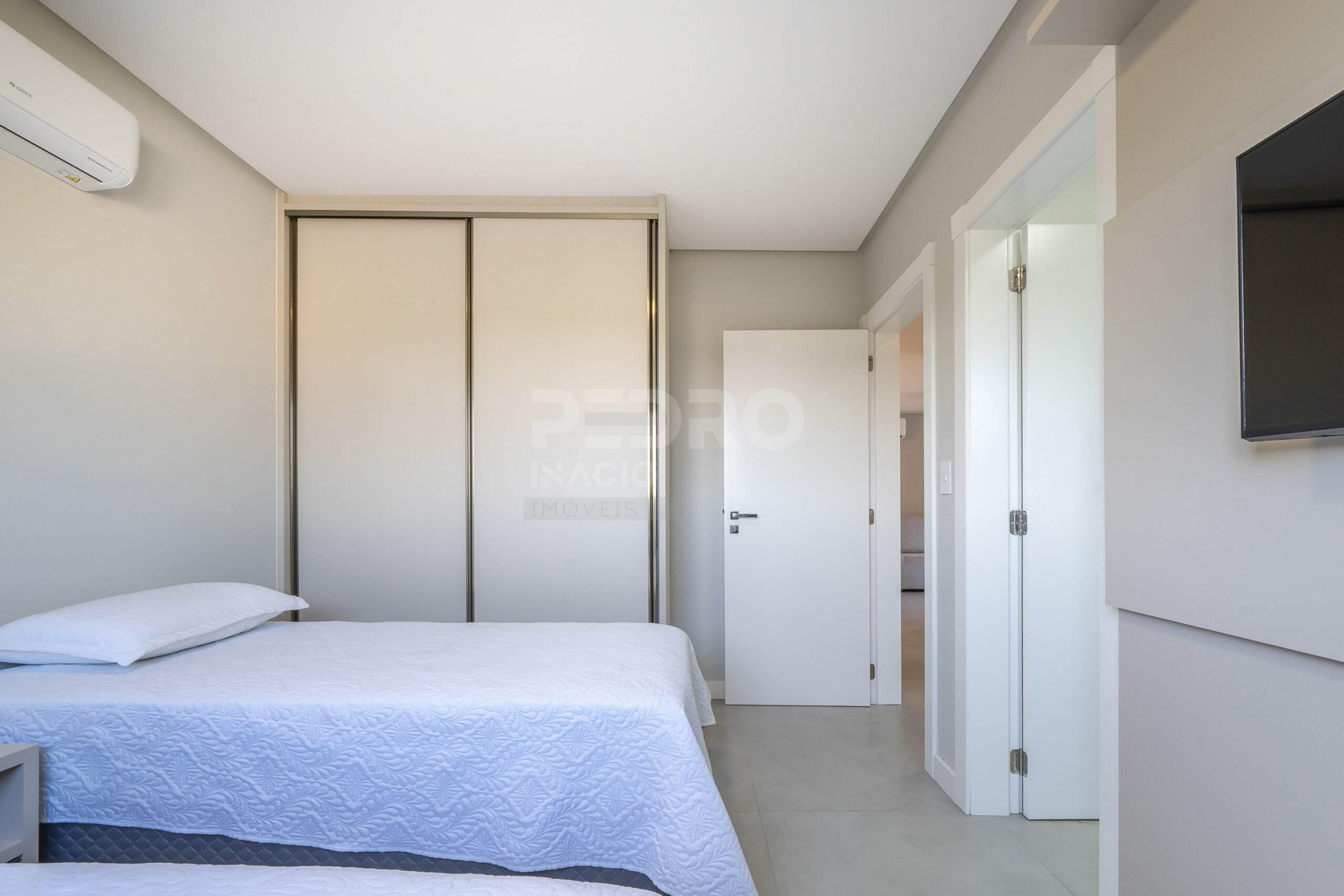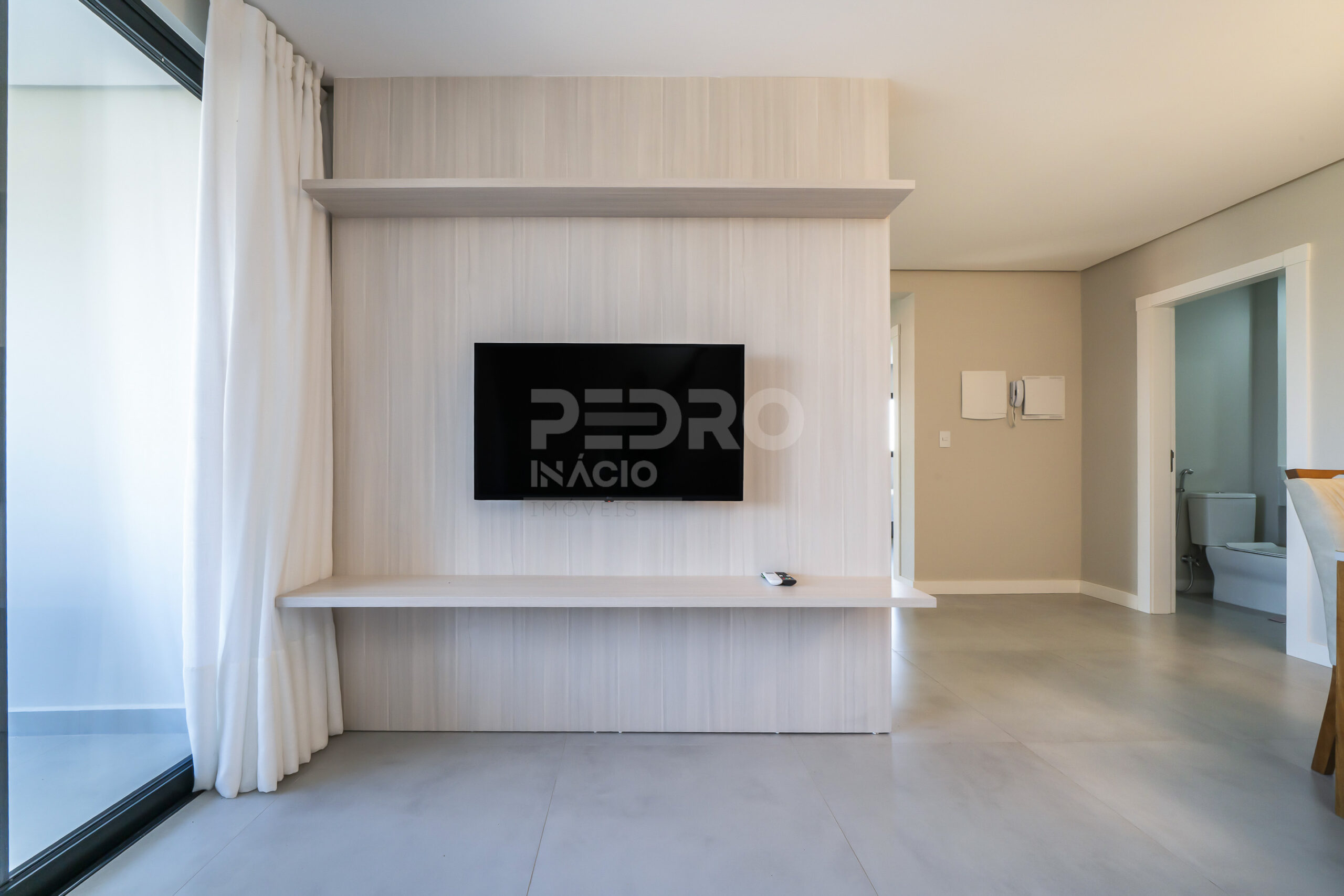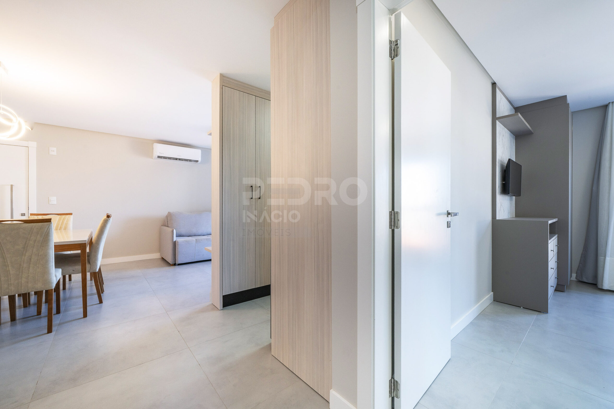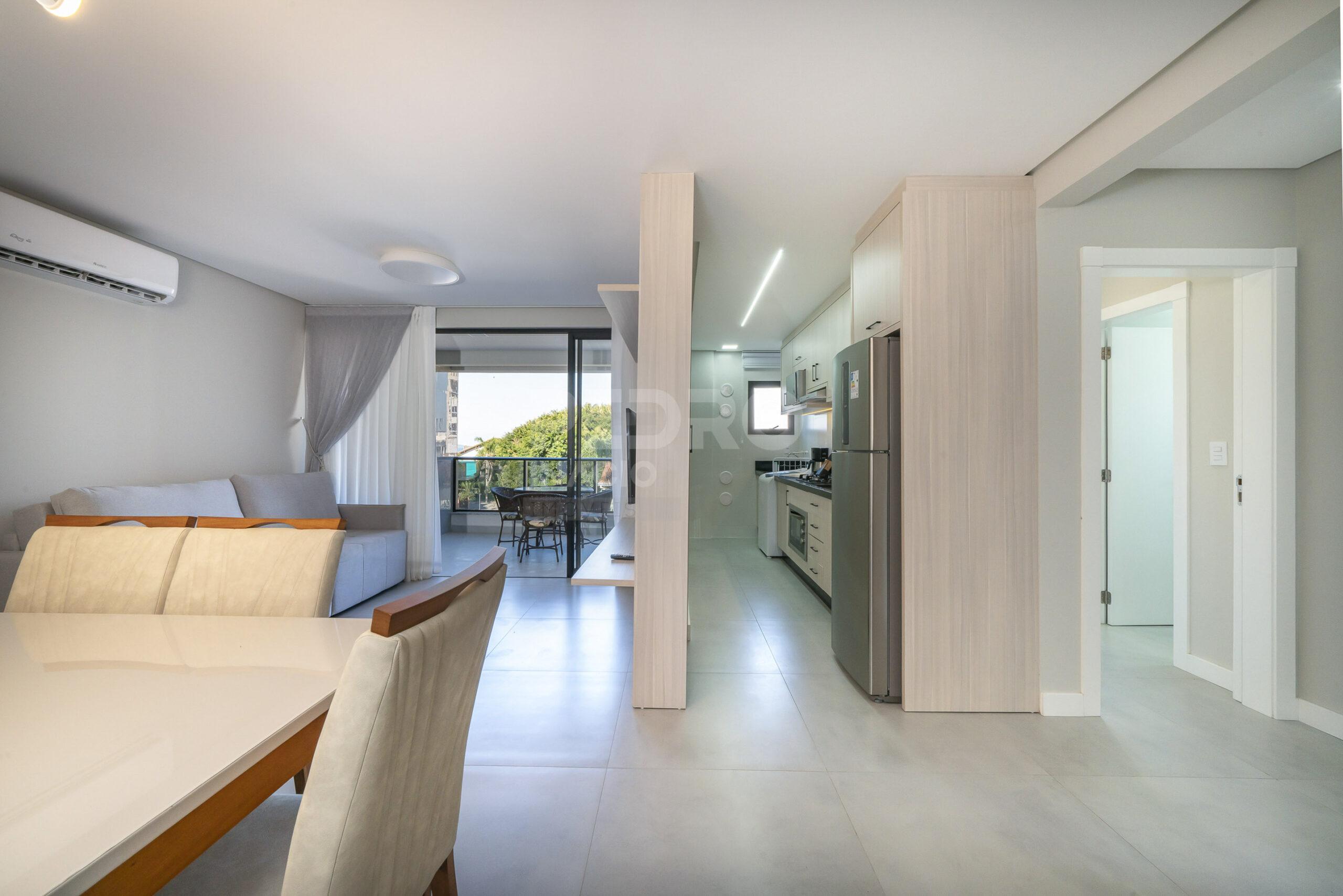 *Salas de estar e jantar integradas com sofá cama, tv e ar condicionado;