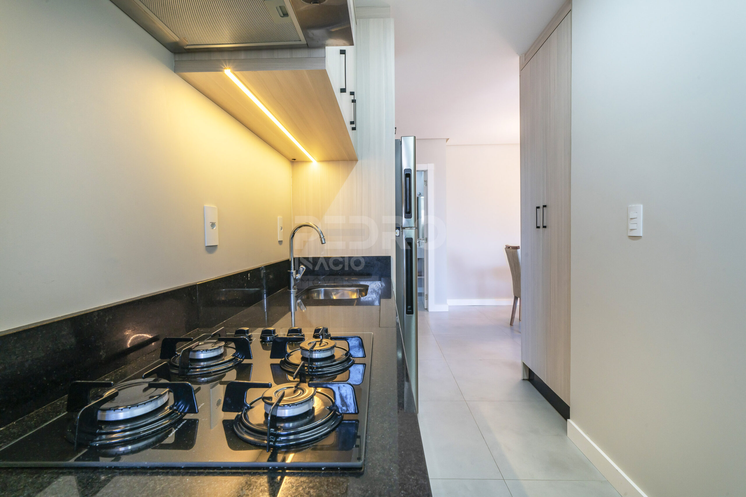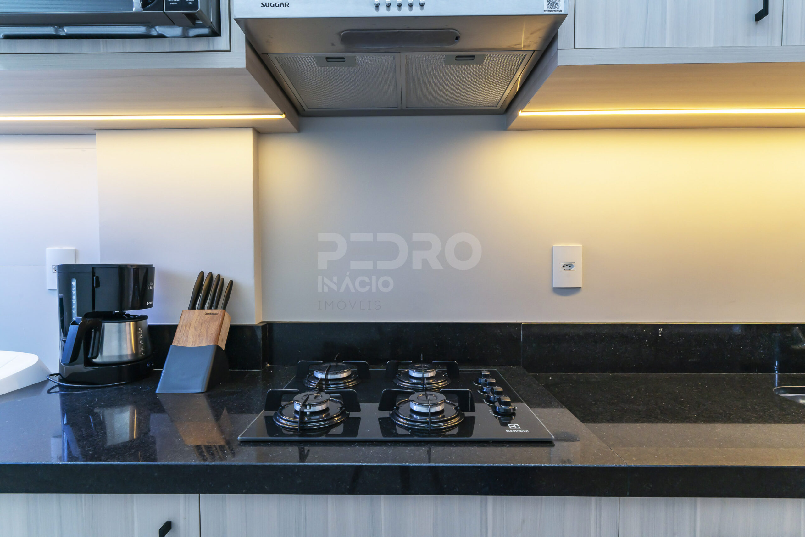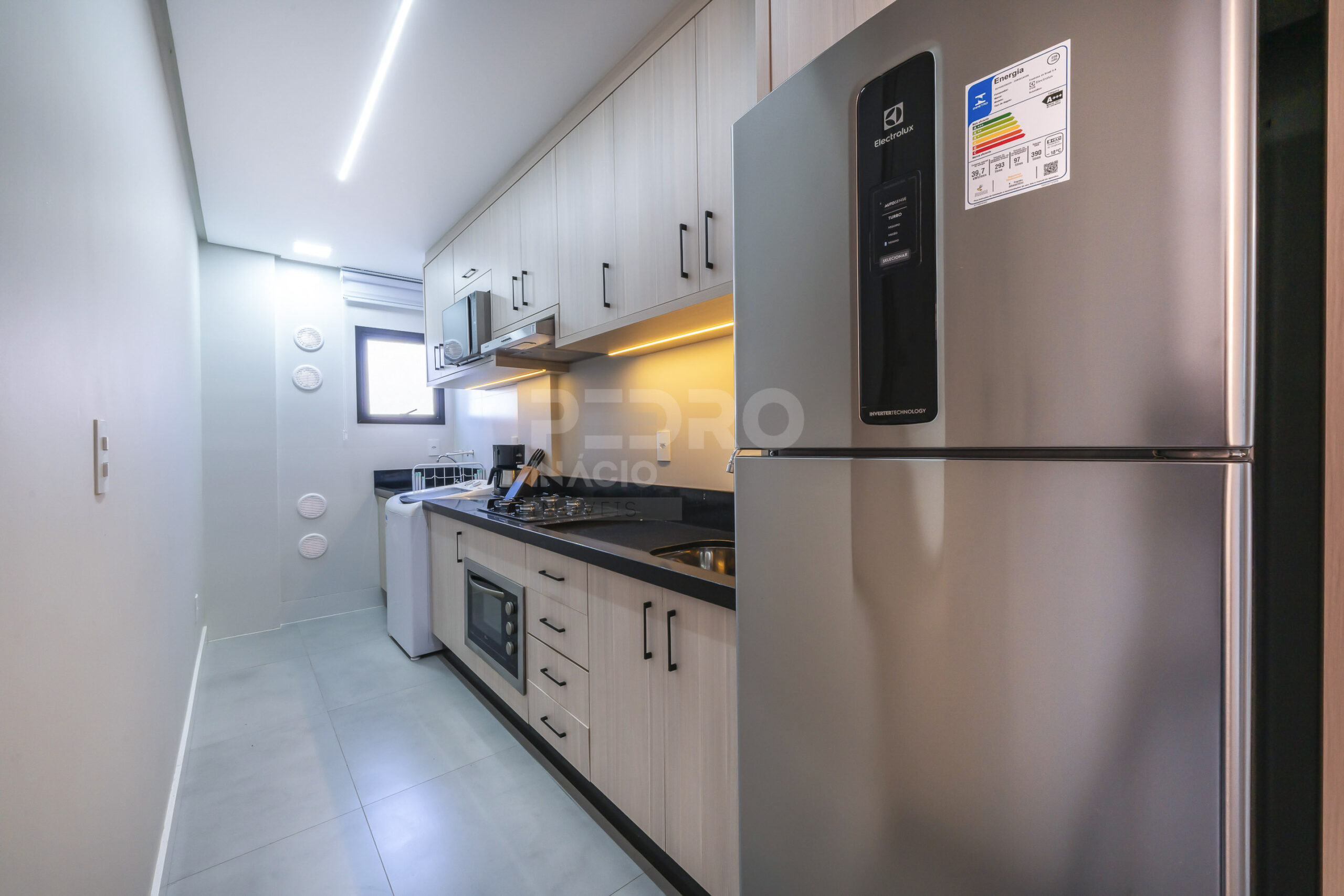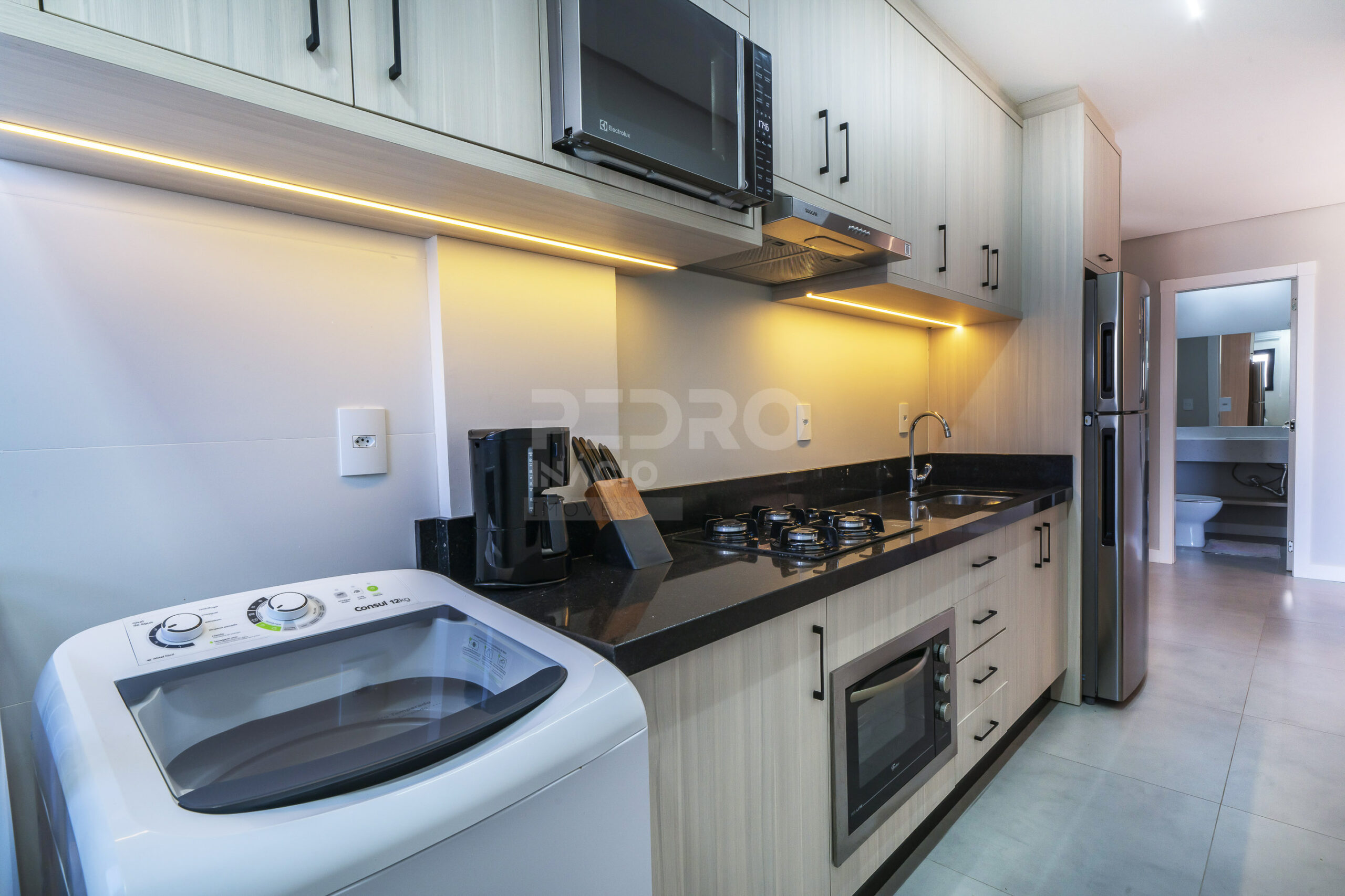 *Cozinha com geladeira, forno, cooktop, microondas e utensílios;
