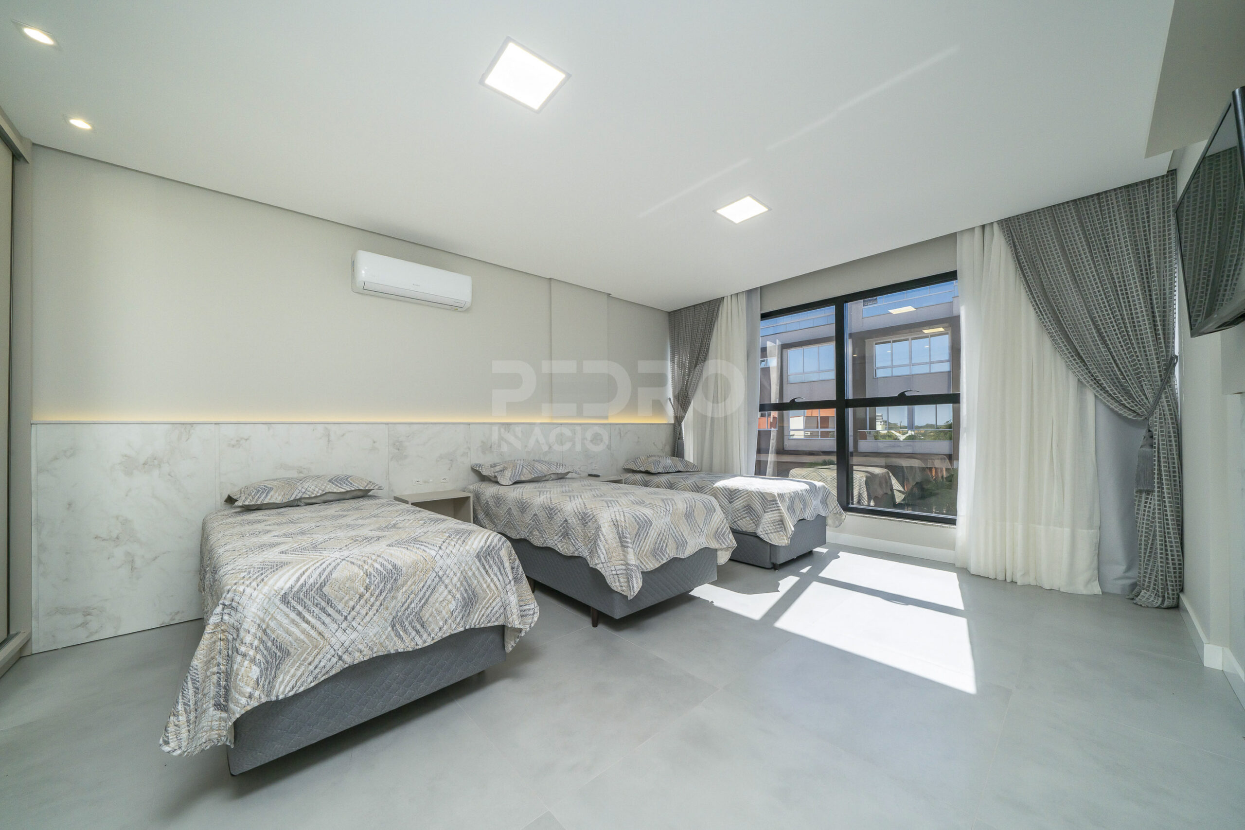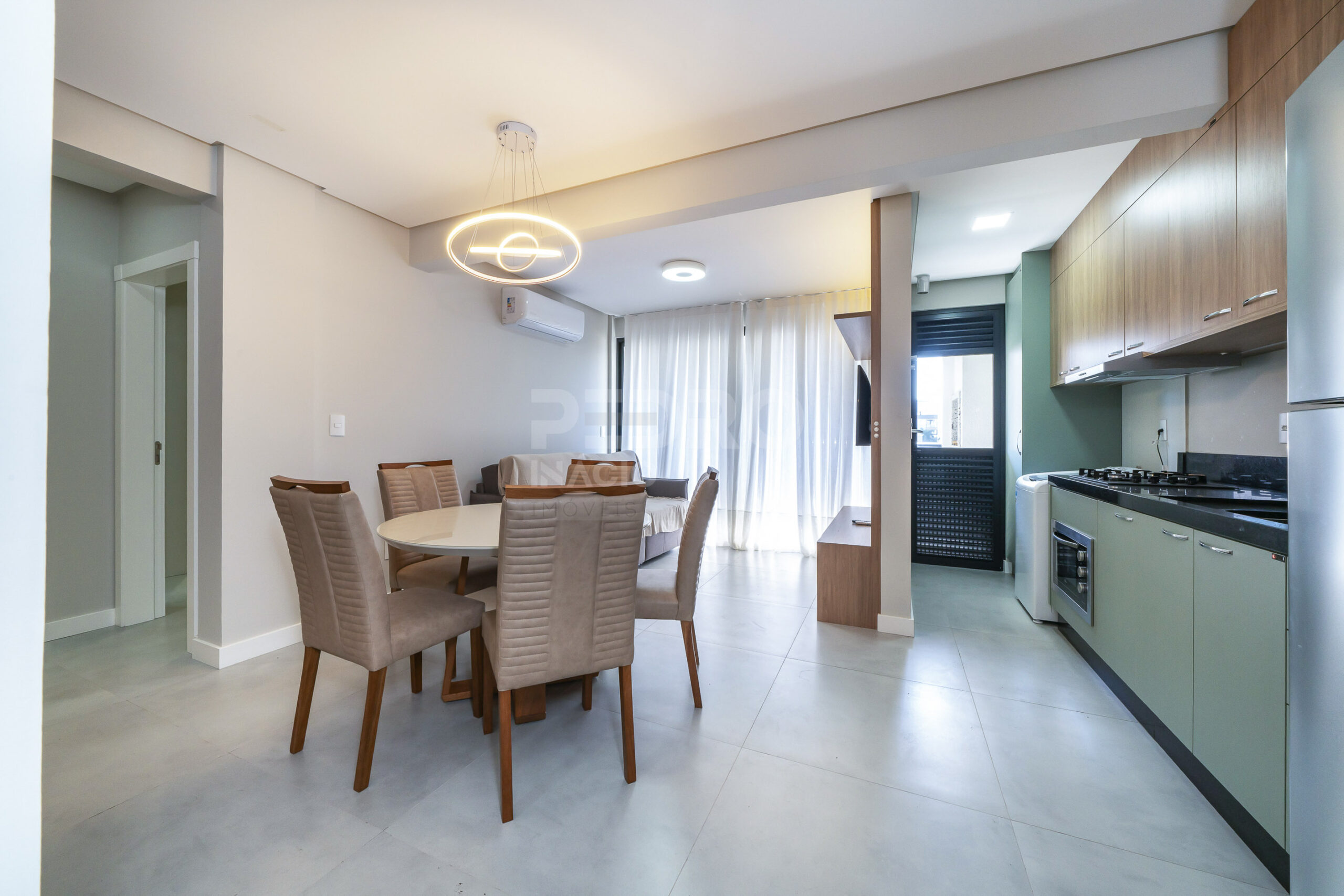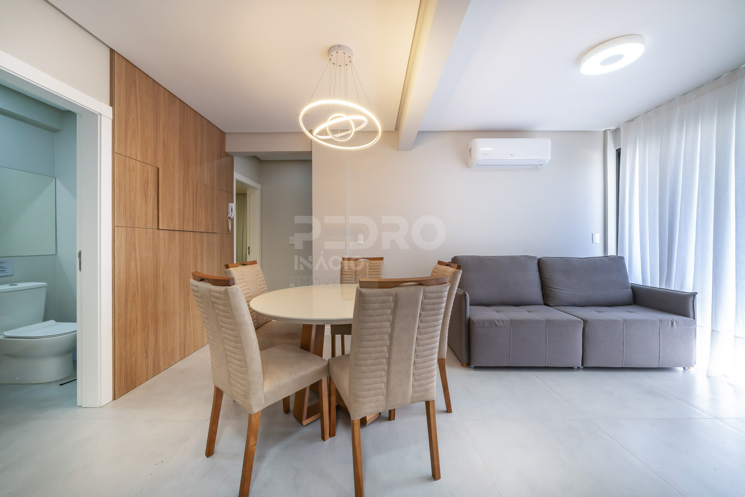 *Salas de estar e jantar integradas com sofá, tv e ar condicionado;