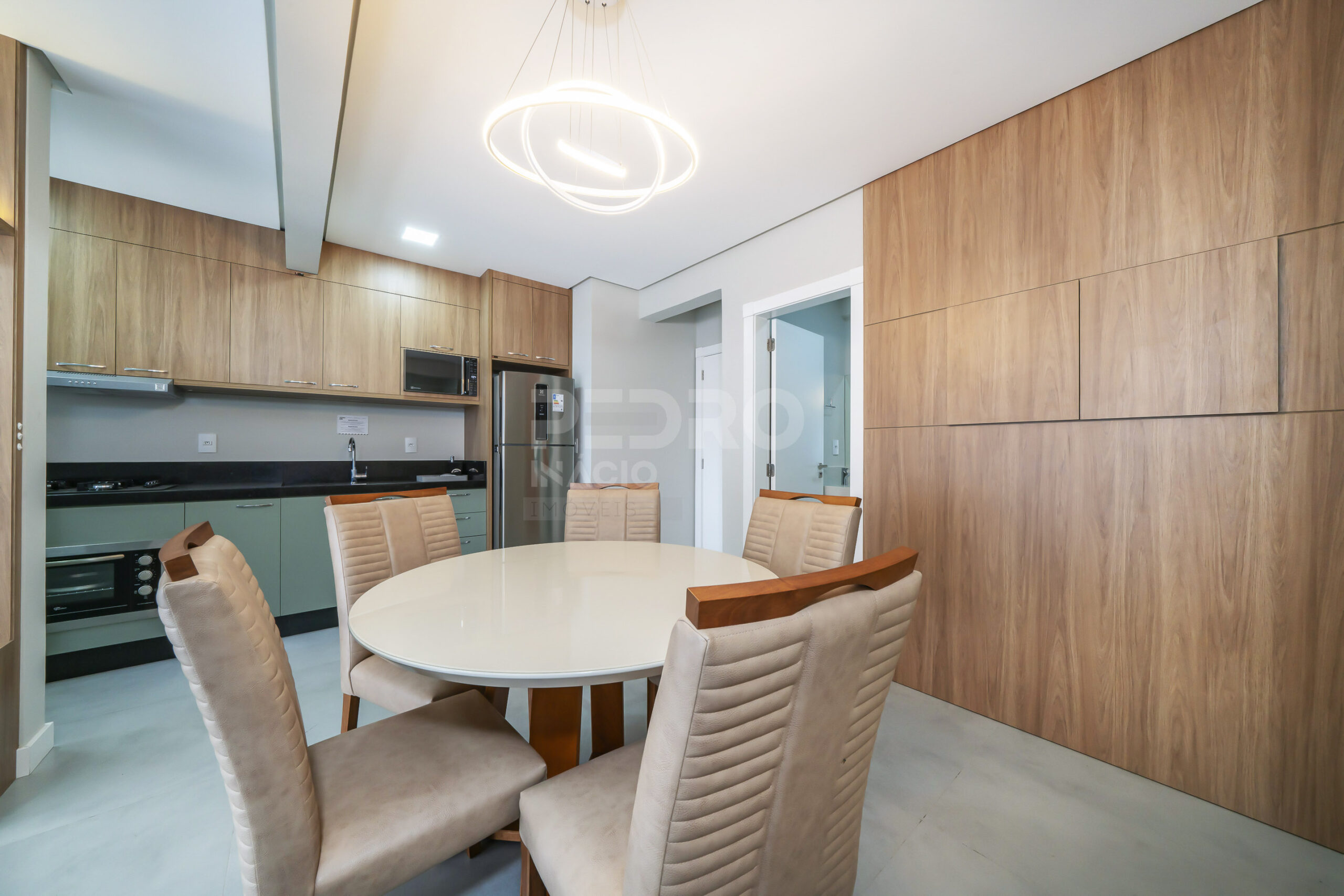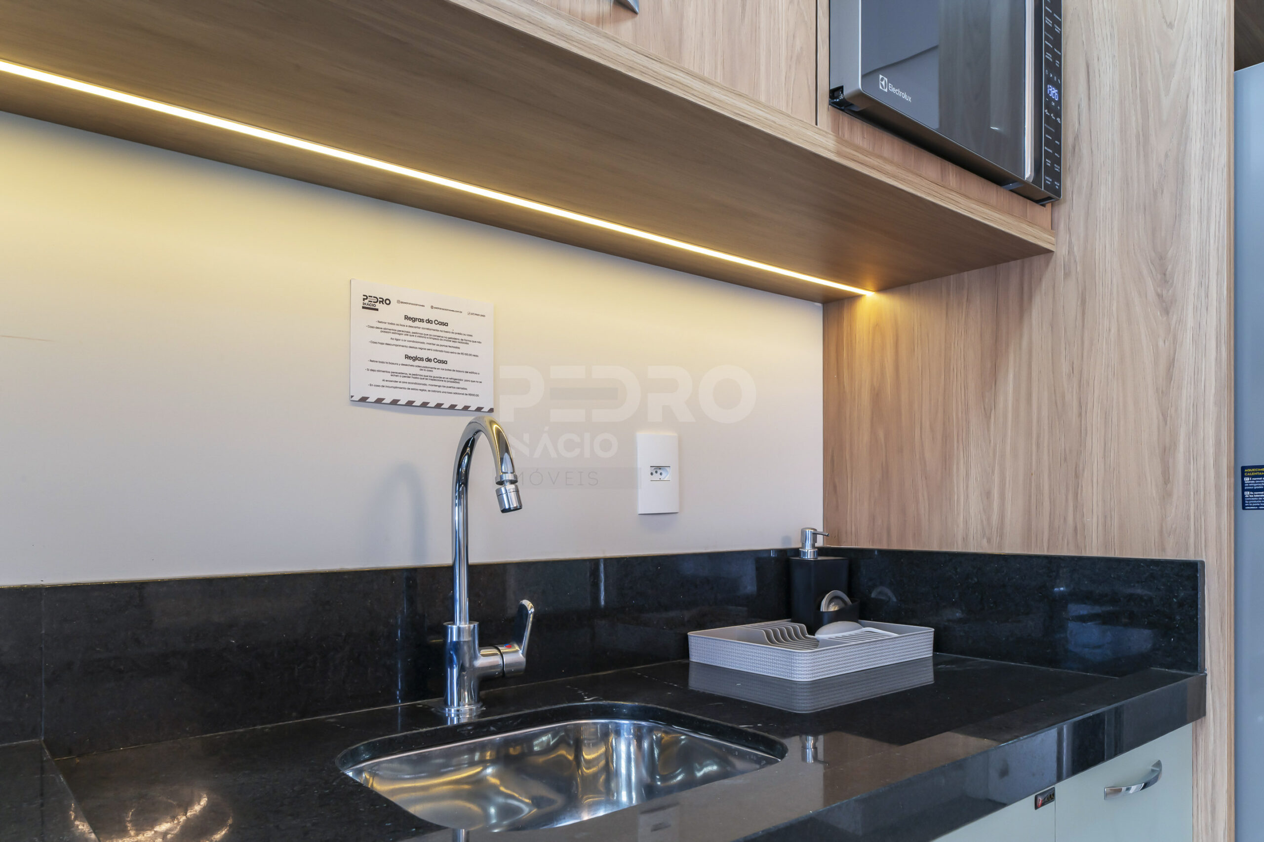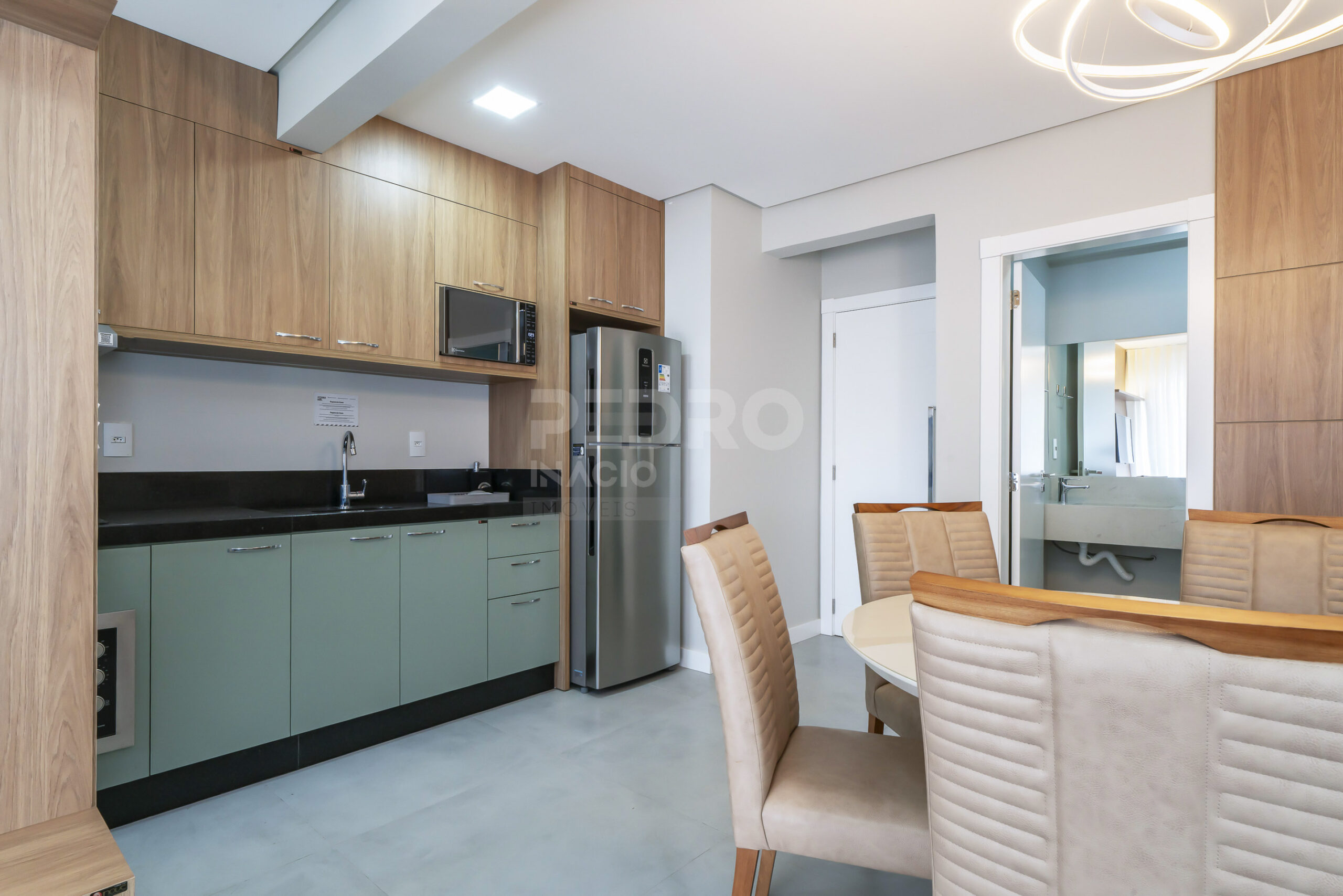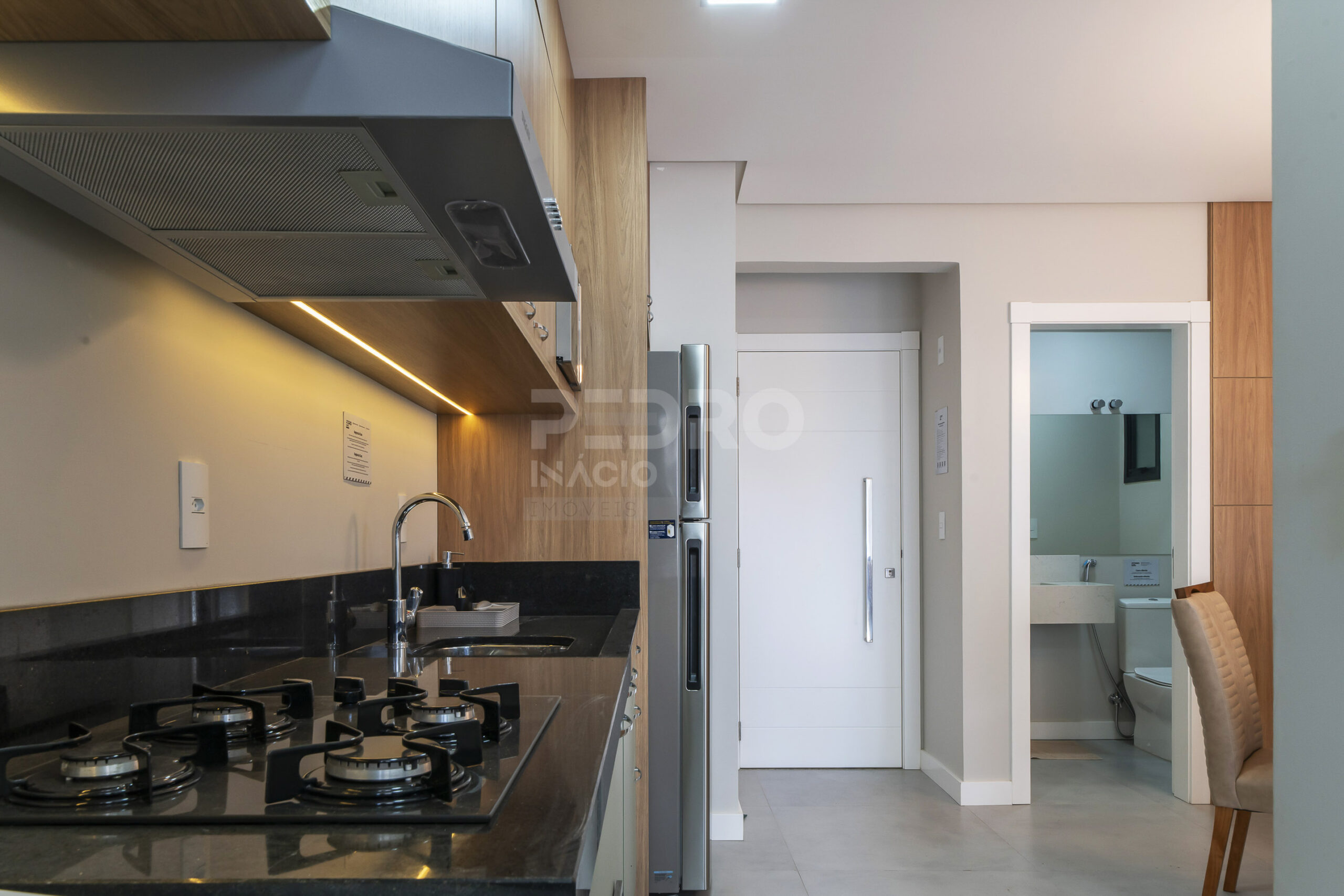 *Cozinha com geladeira, forno, cooktop, micro-ondas e utensílios;